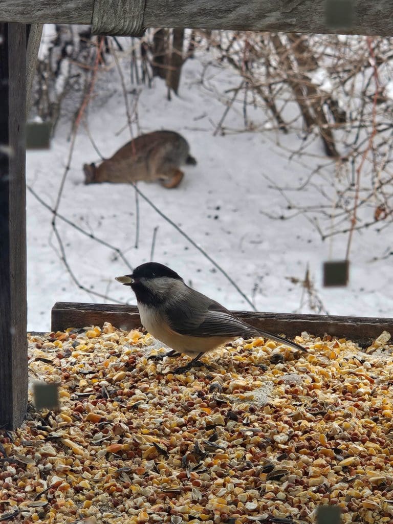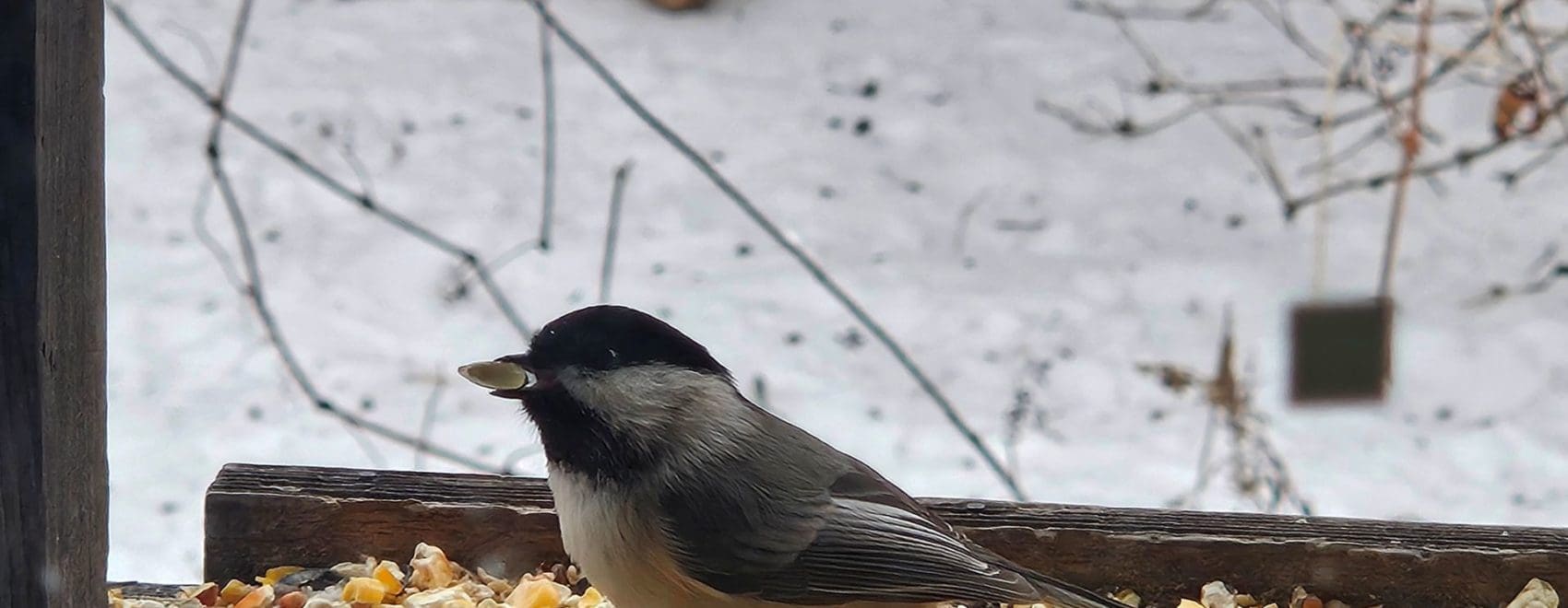 Songbirds that don’t migrate have unique adaptations as well to help survive the cold. Golden-crowned kinglets don’t use tree cavities for shelter from the cold, instead they huddle together in large groups to share body heat. Black-capped chickadees have amazing winter adaptations… they can even shrink and grow their brains! In the fall, chickadees stash food… which means they need to remember where they hid those seeds! So, the hippocampus region of their brain adds more neurons, increasing the volume by around 30%. With their new big brains, they can remember the locations of seeds they hid to gain energy on cold winter days. Once food is more abundant in spring, their brains shrink back down. Chickadees also use a technique called “regulated hypothermia” to lower their body temperature by up to 22 degrees! They reduce the temperature of their feet to just above freezing, instead of wasting heat/energy warming up further parts of their body, they focus on keeping their core warm. Chickadees will also seek shelter in tree cavities, puffing their feathers up like a warm feather jacket.