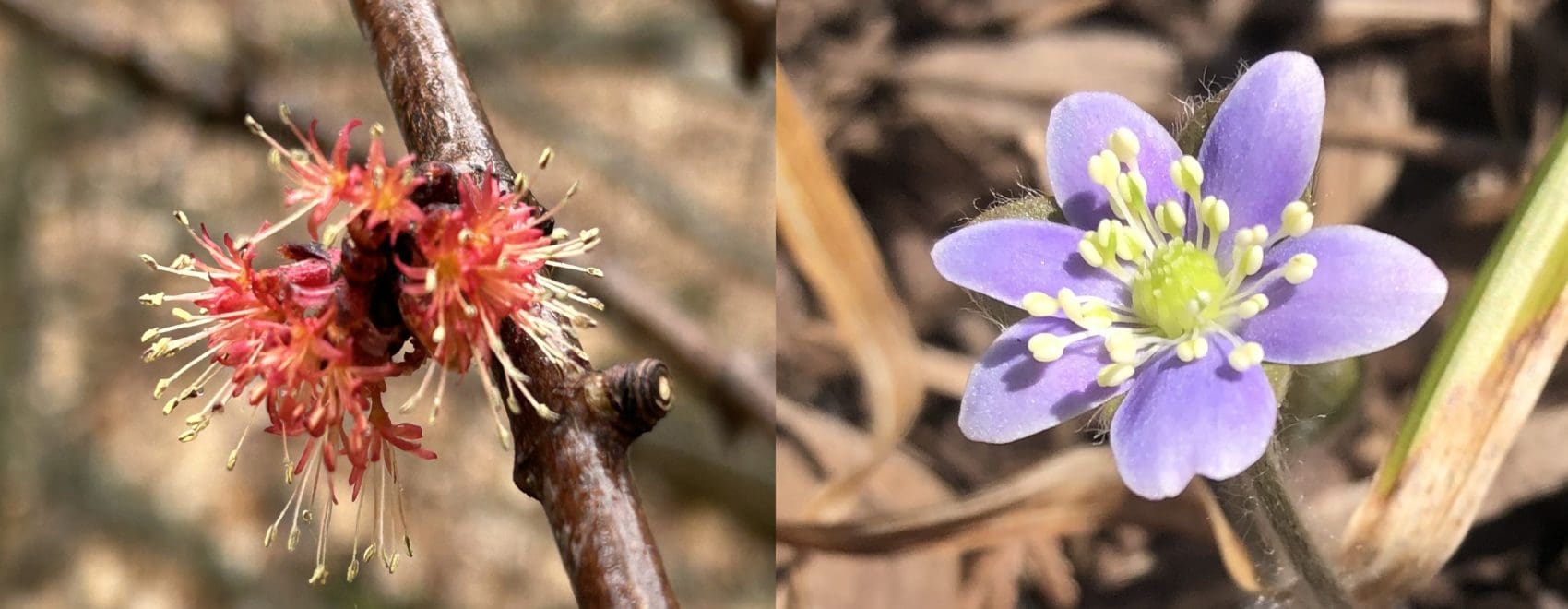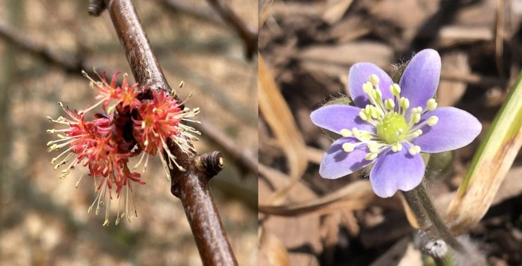 The earliest flowering plant I’ve noticed this year lives amongst the canopy of our woodlands. Red maple (Acer rubrum) is a common tree across many forest types. Red maple is true to its name with leaf and flower buds, emerging flowers and leaves, leaf stalks, fresh seeds, and autumn color all having beautiful red pigmentation. Another closely related tree, silver maple (Acer saccharinum) also has red flowers and can be seen flowering across floodplain forests and urban yards at the same time. Both of these species are generally wind pollinated, but some early pollinators do visit their flowers as well. They are also able to hybridize and produce offspring called Freeman’s Maple (Acer x freemanii).