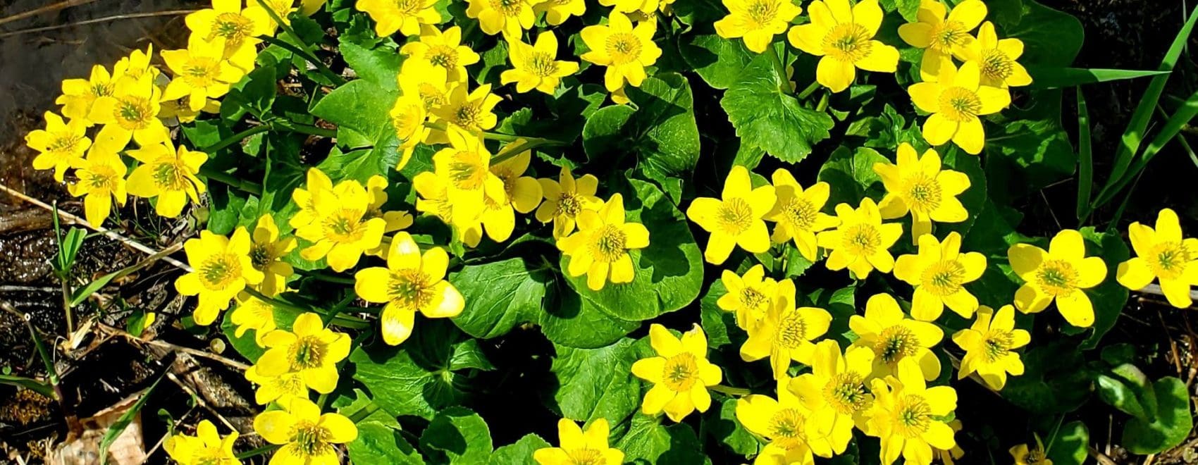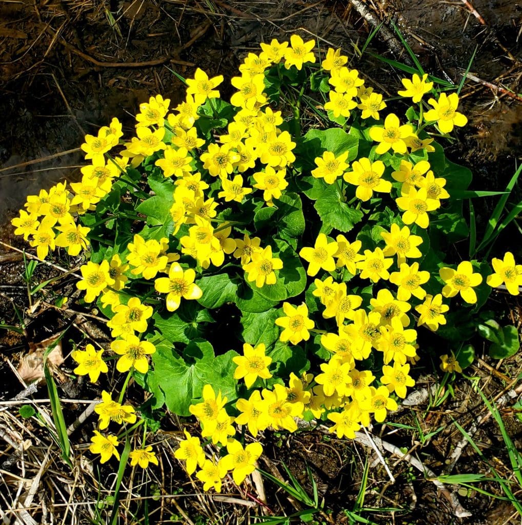 During the spring, the wet areas of the State Natural Area fill with sunshine, both literally as the weather warms and the sun shines through, but also in the bright yellow color of one of my favorite spring plants… marsh marigold. Unlike its name suggests, marsh marigold (Caltha palustris) is actually a member of the buttercup family (Ranunculaceae). However, its name isn’t totally misleading. Caltha is derived from the Ancient Greek word kálathos, meaning “goblet” referring to the shape of the flowers. Palustris is Latin for “of the marsh” indicating the habitat that it is often found growing in.