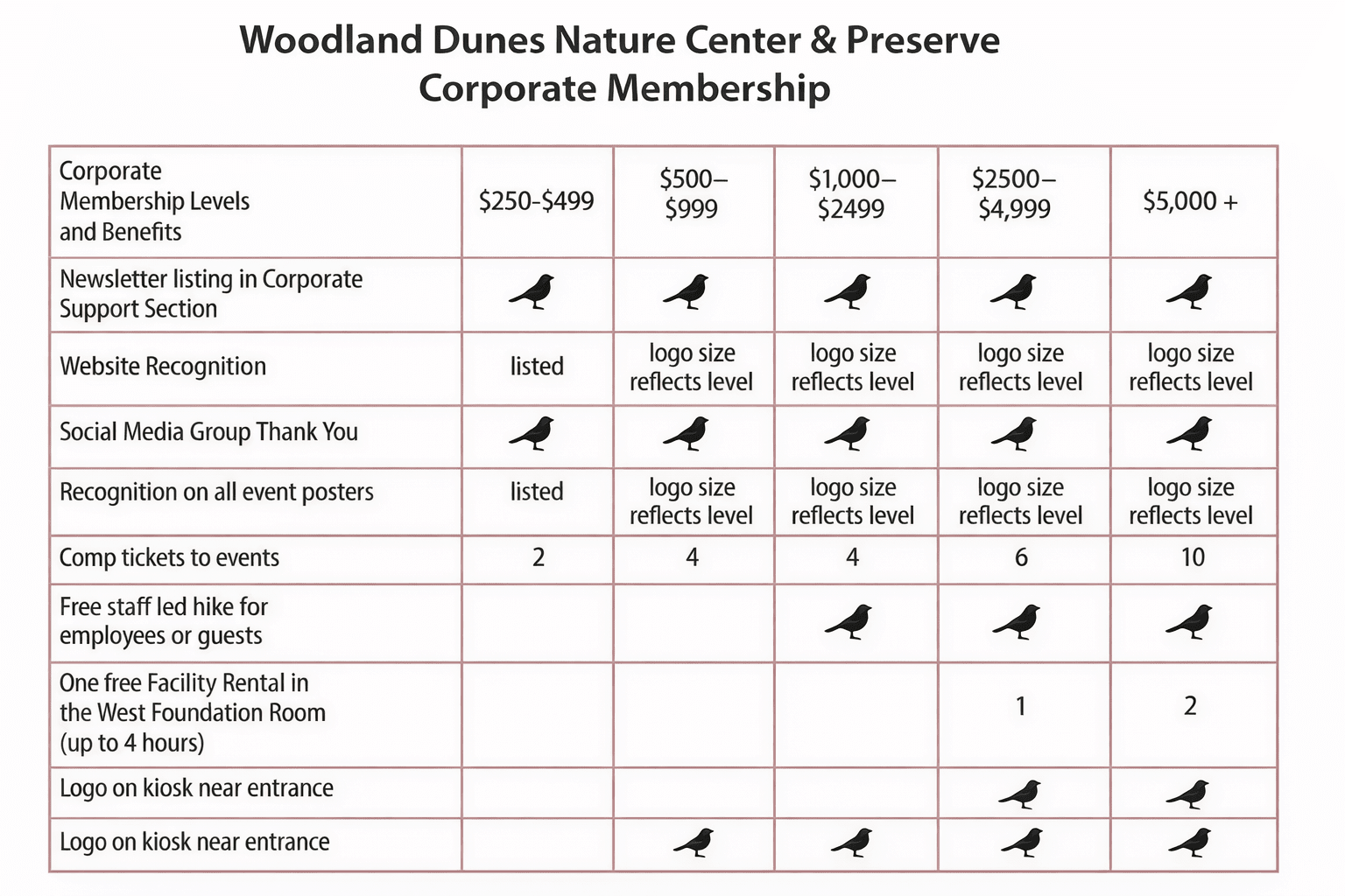 Welcome and thank you for your crucial support. As a Woodland Dunes Corporate Member, you are pledging to care for this unique space in our community that is not only good for wildlife, but for people too.